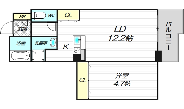 リビング12.2帖、洋室4.7帖と広々としたお部屋になっており、広いリビングとしっかりとした空間の寝室がございます!