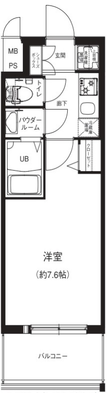 22.71m2の間取りは1Kとなっており、洋室は7.6帖のお部屋になります。