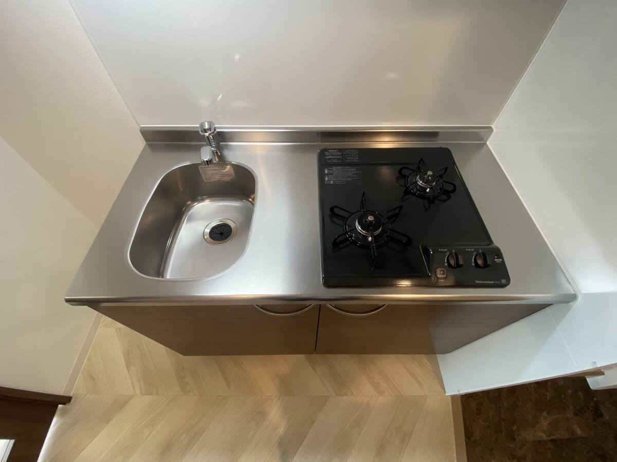 システムキッチンは、ガス対応のコンロ2口が付いております!