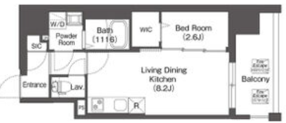 30.44 m2の間取りは1DKとなっており、LDKは8.2帖と洋室は2.6帖のお部屋になります。