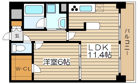 43.04 m2の間取りは1LDKとなっており、LDKは11.4帖と洋室は6帖のお部屋になります。