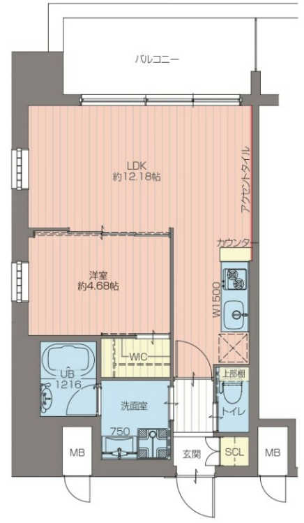 40.80 m2間取りは1LDKとなっており、LDKは12.18帖と洋室は4.68帖のお部屋になります。